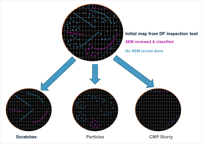 Increasing the number of inspection points forces chipmakers to dig through more sample data, driving the need to classify defects more accurately. As an example, in automotive fabs the chemical mechanical planarization (CMP) step can produce three major types of defects: scratches, particles and CMP slurry remnants. Each defect can have a different impact on functionality and performance, so it’s important to have a system that accurately differentiates them and marks each chip on the wafer as either good or bad – a process called “binning.”