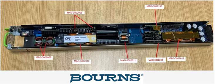 Arrow-ST-Bourns 5.5kW AI server power supply — This power supply complies with the ORV3 standard, with a power density of up to 65W/In³. Its output voltage ranges from 48-54V (typical value: 48-50V), and its input voltage range is 180V AC to 305V AC. It achieves a peak efficiency of 97.5%, with a surge power 1.5 times the nominal output power. It supports firmware upgrades in the field (using a bootloader), active current sharing on top of droop, and hot insertion/removal (hot-plug). The rectifier can communicate via PMBus (up to 100kbps) and ModBus (up to 115kbps) and features an internally controlled variable-speed fan. The bill of materials (BOM) primarily uses ST components.