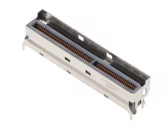 Mini Cool Edge (MCIO) connector — This Mini Cool Edge connector, introduced by Molex, is a vertical, 16x PCIe Gen5, 124-circuit connector. It features 0.75µm gold (Au) plated contacts, 1.50mm solder peg length, and a 1.27µm nickel-plated shell with a pick-and-place cap. It is a wire-to-board receptacle, with a maximum current of 1.1A per contact and a maximum voltage of 30V AC (RMS)/DC. The data rate can reach 32.0 Gbps, and the operating temperature range is -40°C to +85°C. It uses surface-mount terminal interfaces and complies with EU RoHS directives, REACH SVHC (substances of very high concern), and low-halogen standards.