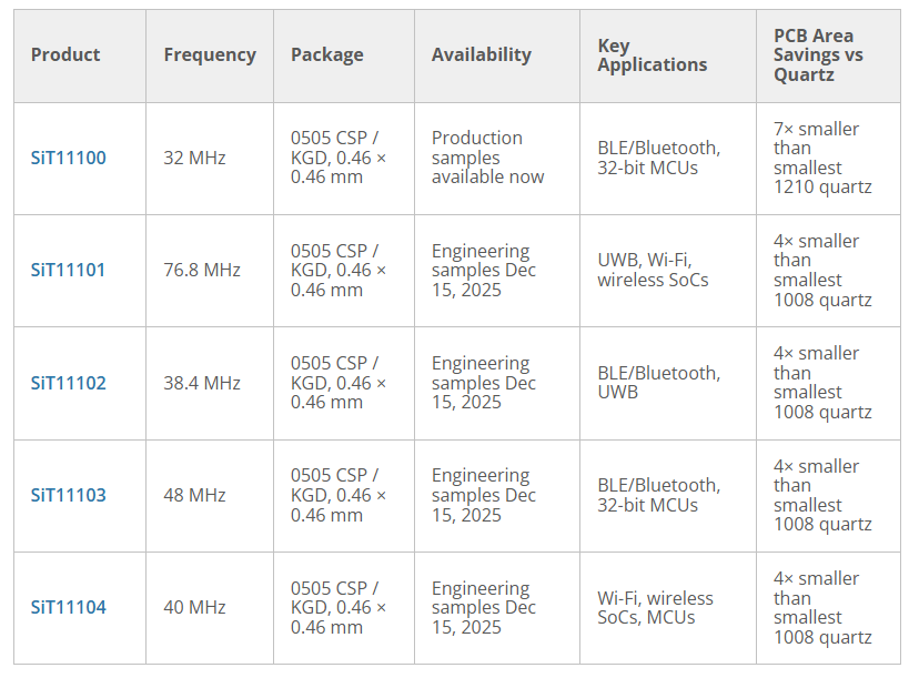 The SiTime Titan family of MEMS resonators address these limitations, lowering power consumption by 50% and enabling the industry’s smallest resonators with sixth-generation FujiMEMS technology. The 0505 chip-scale package (CSP) measures 0.46 × 0.46 mm and reduces PCB area by 7× compared to the smallest 1210 quartz package at 32 MHz—and 4× compared to the smallest 1008 quartz options at higher frequencies. Notably, the initial five Titan resonators support key frequencies for BLE/Bluetooth, microcontrollers (MCUs), and a broad range of wireless system-on-chips (SoCs).