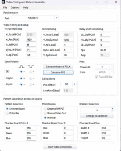 Both serializer and deserializer devices can generate a pattern using the video pattern generator (VPG) or patgen for shorthand. The VPG parameters are fully configurable and conveniently located in the GMSL GUI, allowing you to tweak and tune the video timings of the resolutions, frame rate, and sync polarities.